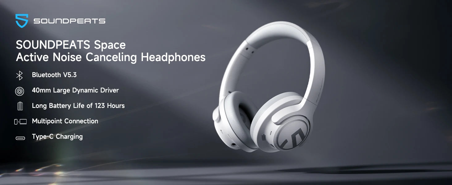 SoundPEATS Space Headphones Bluetooth 5.3 Hybrid Active Noise Cancelling Wireless Headphone,123H Play,Mic,Multipoint Connection